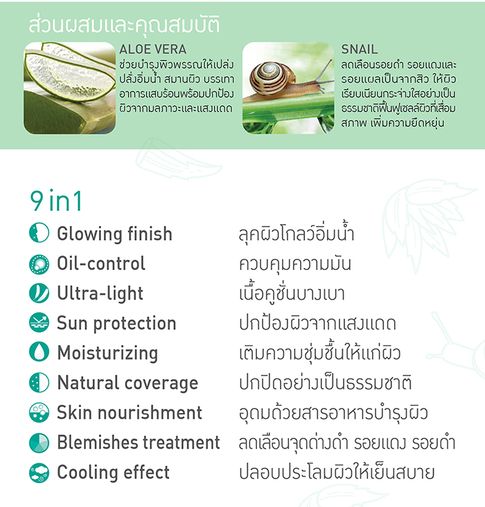 Уставшей коже возвращает сияние и силу с помощью увлажняющих средств. Насыщен улиточной слизью и алое, отлично маскирует все покраснения, шрамы и темные пятна, тем самым раскрывает привлекательность вашей сияющей кожи.