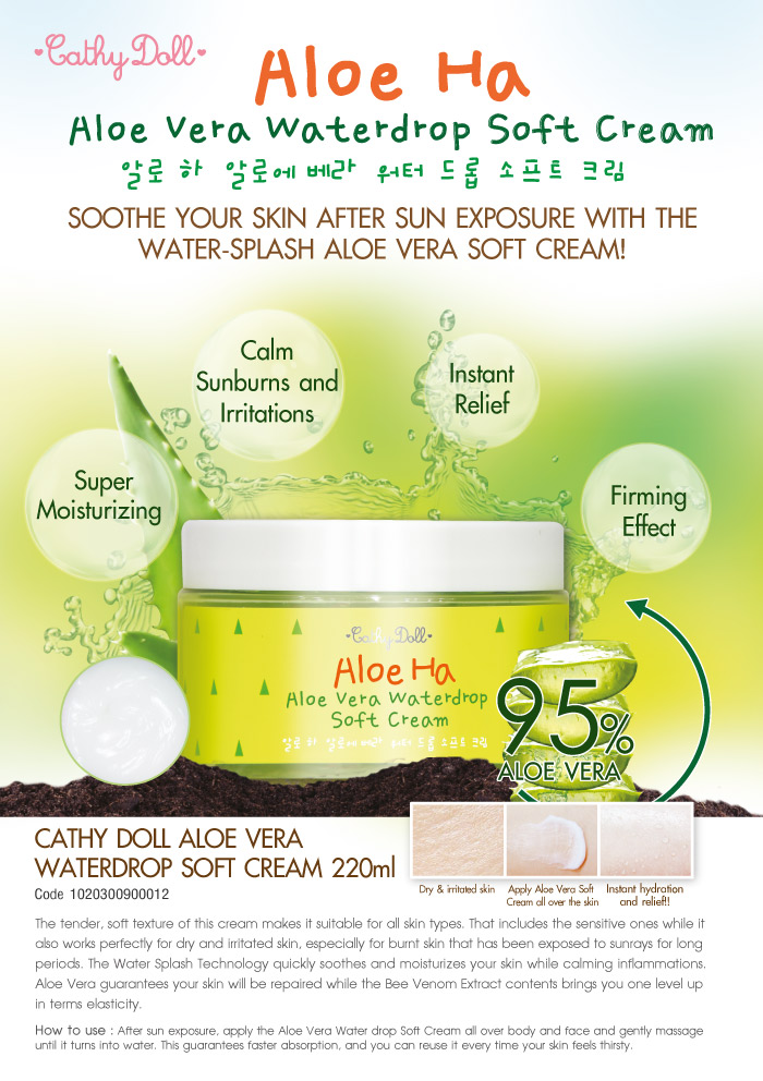 О целебный свойствах столетника, или алоэ вера, людям было известно еще тысячи лет назад! Существует легенда, согласно которой Александр Македонский принял решение о завоевании некоторых территорий из-за того, что на них культивировались растения с уникальной, почти волшебной целительной силой. Пройдя рука об руку с человеком сквозь века, заслужив почетное место в традиционной медицине множества стран по всему Миру, алоэ вера даже в эпоху высоких технологий не утратило актуальности. Сегодня изучения состава и свойств растения продолжается, ведь среди 200 биологически активных веществ, включающих ряд аминокислот, антиоксидантов, минералов, микро и макроэлементов, встречаются «белые пятна», которым, вполне возможно, предстоит стать ярким открытием будущего. Алоэ вера в косметике - универсальный компонент, который не имеет равных в плане интенсивности и спектру положительных действий. Экстракт, сок, мякоть способствуют омоложению и профилактике старения, лечат заболевания кожи и прыщи, предупреждают возникновение угревой сыпи, черных точек, воспалений, раздражений, устраняют шелушение, сухость, зуд, дряблость, морщины, повышают упругость, борются с гиперпигментацией, небольшими шрамами, гиперфункцией сальных желез, тусклостью тона, улучшают местный иммунитет и способность противостоять агрессивным факторам. Корейская фирма Cathy Doll также не прошла мимо природного лекаря и косметолога, выпустив свои, исключительно эффективные и приятные в применении, продукты!