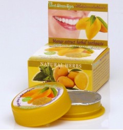 Одну из таких паст вы теперь сможете купить в нашем интернет магазине натуральной косметики из Тайланда - это тайская зубная паста с манго и борнеолом и отбеливающим эффектом, размещенная в таре, имеющей форму круглой коробочки.